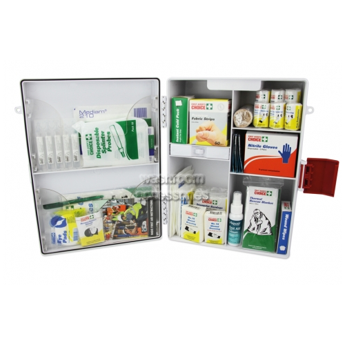 876479 Did you know? Features: Case dimensions: Kit Contents: Cuts & Abrasions: -Adhesive Premium Fabric Strips x 50 -Combine Dressing 10cm x 20cm x 1 -Gauze Pieces (Sterile) 7.5cm x 7.5cm Pk5 x 3 -Non-Adherent Dressing 5cm x 5cm x 6 -Non-Adherent Dressing 7.5cm x 10cm x 3 -Non-Adherent Dressing 10cm x 10cm x 1 -Wound Dressing No.14 (Medium) x 1 -Wound Dressing No.15 (Large) x 1 -Wound Wipes x 10 Sprains, Fractures & Bruising: -Bandage - Conforming 5cm x 1.8m x 3 -Bandage - Conforming 7.5cm x 1.8m x 3 -Bandage - Crepe Medium Support 10cm x 2m x 1 -Instant Cold Pack x 1 -Triangular Bandage Disposable 110cm x 155cm x 2 Burns, Bites & Stings: -Antiseptic Spray 50ml x 1 -Hydrogel Sachet 3.5g x 5 Eye Injury: -Eye Pad x 4 -Sodium Chloride (Saline) Pods 20ml x 8 CPR, Rescue & Survival: -Blanket - Thermal x 1 -Resuscitation-Safe Face Shield - Disposable x 1 Essentials: -Adhesive Non-Woven Tape 2.5cm x 5m x 1 -Biohazard Bag x 1 -First Aid Booklet x 1 -Forceps - Disposable x 1 -Nitrile Gloves Pack (Pairs) x 5 -Pen x 1 -Plastic Bag Zip Lock (Small) x 2 -Plastic Bag Zip Lock (Medium) x 2 -Plastic Bag Zip Lock (Large) x 2 -Register Of Injuries Book x 1 -Safety Pins - Assorted x 12 -Scissors x 1 -Splinter Probe - Disposable x 10