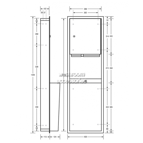 ML705SM : Surface Mounted Paper Towel Dispenser and 49 Litre Waste Receptacle Satin Stainless Steel SPECIFICATIONS Material/Finish #304 Satin Stainless Steel Features Unit fitted with two tumbler locks (keyed alike) Full length piano hinge on door Seamless welds, rolled edges Waste container is locked into cabinet Dispenser/Options 600 C-fold paper towels 800 Multi-fold paper towels Disposal: 49L Removable Stainless Steel waste container Supplied with Fitted Surround Unit is supplied with 2 keys SIZES: Overall Size of Surface Mounted Model : 438mmW x 1420mmH x 240mmD Overall Size of Recessed Model : 438mmW x 1420mmH x 237mmD Wall Opening for Recessed Model: 400mmW x 1390mmH x 110mmD